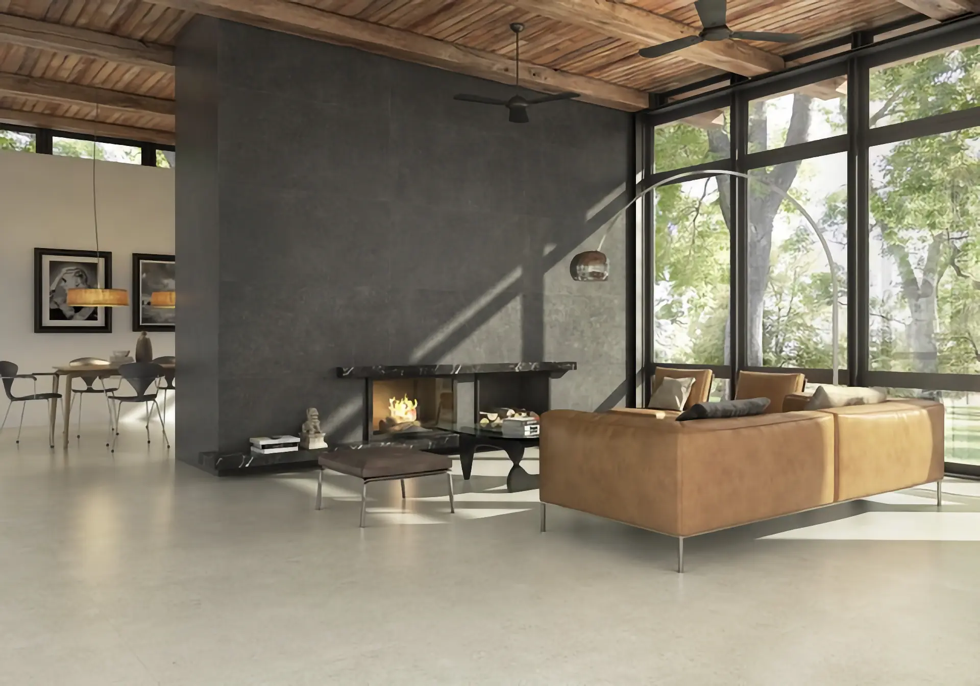 Warme Holztöne und Naturmaterialien finden mit diesen Feinsteinfliesen ein grossartiges Pendant für ein stimmiges, modernes und gemütliches Zuhause.